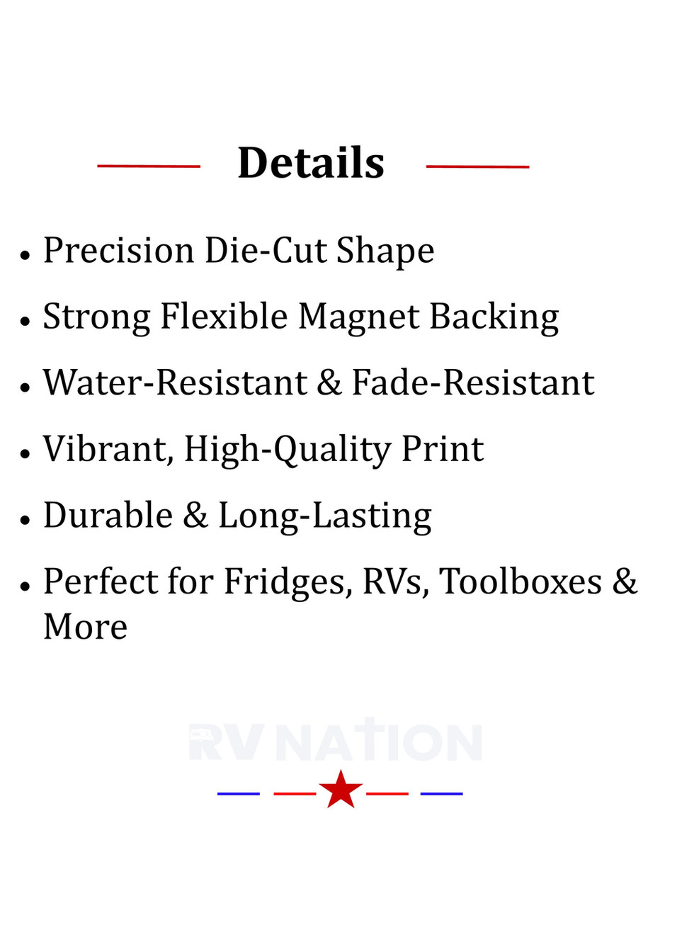 Printed in rich, vibrant color and precision cut for a clean edge, this flexible magnet is waterproof and built to last. Strong enough to hold securely on your fridge, toolbox, or RV metal surface — yet lightweight and durable for everyday adventure.