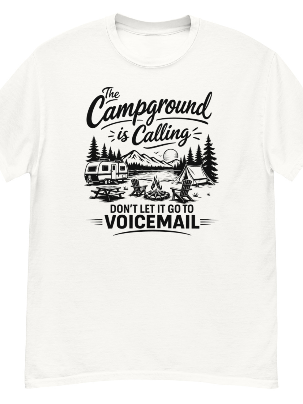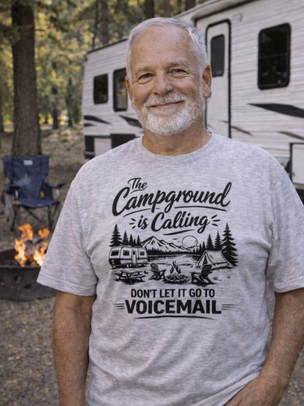 You hear it…The crackle of the fire, the quiet of the trees, that feeling when you finally unplug. Some calls can wait…but the campground? Not a chance 😄 This tee is for those who’d rather be parked under the trees than anywhere else. Whether you're already set up by the fire or just counting down the days until your next trip, this one says it all.